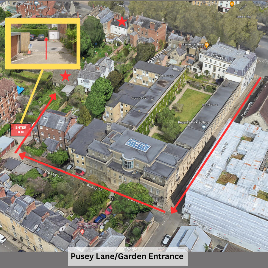 If coming from St Giles (on foot), proceed down Pusey Street. Take the first right, Pusey Lane, until you reach the garages. On your right will be a large wooden door. Proceed ahead, through the small wooden garden door and around to the building entrance.