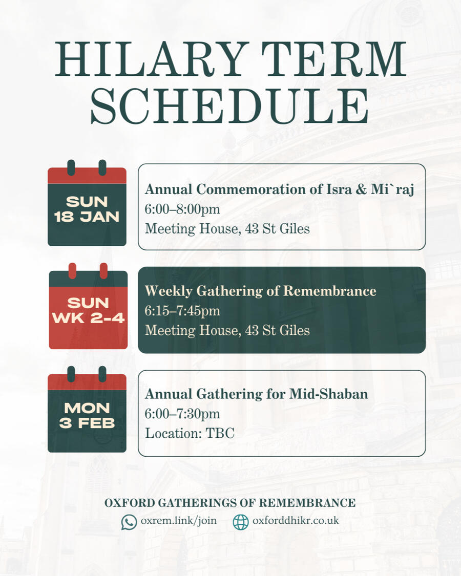 Oxford Gatherings of Remembrance is a society of university and community members gathering every Sunday during term time to share in dhikr (remembrance of God), poetry, and the study of classical texts of Islamic spirituality. We also commemorate nights of sacred merit in the Muslim calendar.Our termly schedule is published below. You may also join our WhatsApp announcement group to receive announcements.